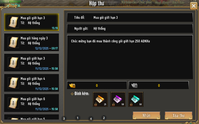 Bước 5: Sau khi giao dịch thành công vào trò chơi và nhận gói quà đã mua tại hòm thư