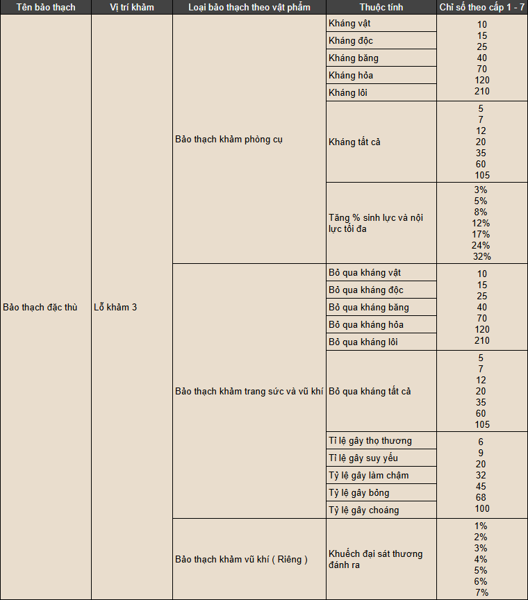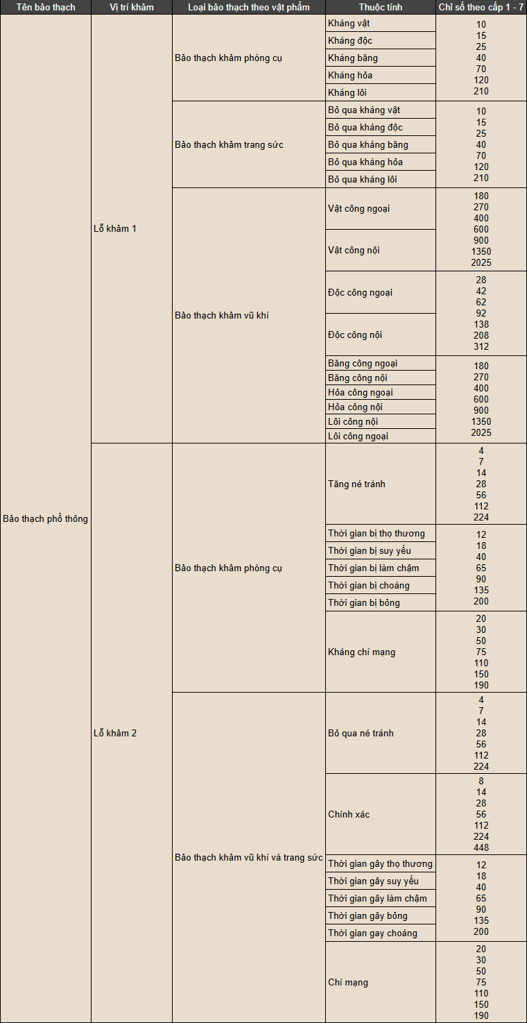 Bảo Thạch là tính năng giúp người chơi gia tăng chỉ số thuộc tính cho trang bị, từ đó tăng sức mạnh nhân vật. Mỗi trang bị có thể được khoan tối đa 5 lỗ, tương ứng với các loại Bảo Thạch sau: