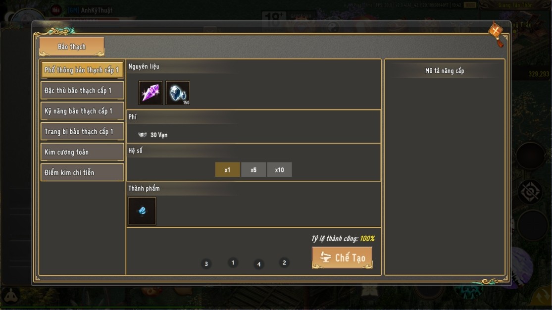 03 Viên Bảo Thạch, Cùng loại và cùng cấp | 30 | 100 | 3000 | 1 | Thăng cấp bảo thạch | Mất toàn bộ nguyên liệu |