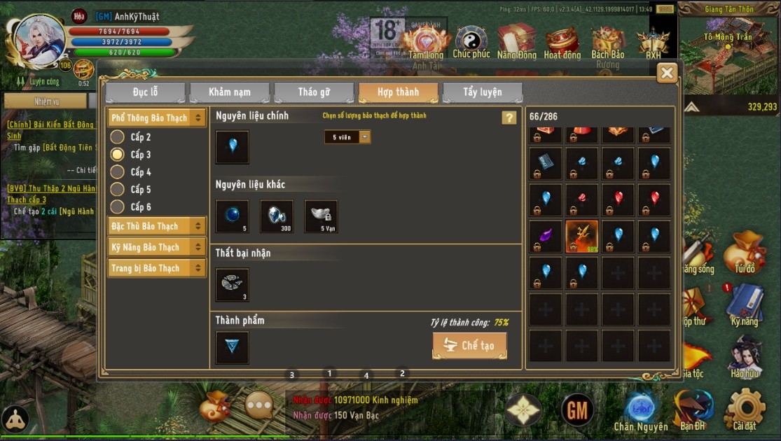 Bước 2: Chọn loại bảo thạch và cấp độ bảo thạch muốn ghép (Bảo Thạch Phổ Thông / Đặc Thù / Kỹ Năng / Trang Bị)