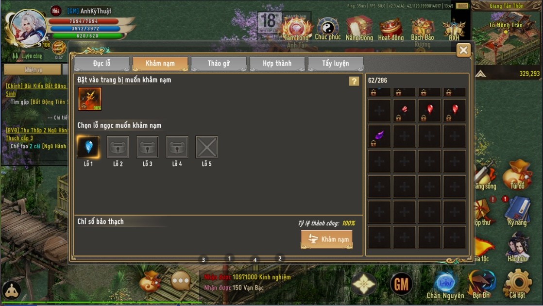 Bước 1: Đặt trang bị muốn khảm nạm hoặc tháo gỡ bảo thạch vào giao diện