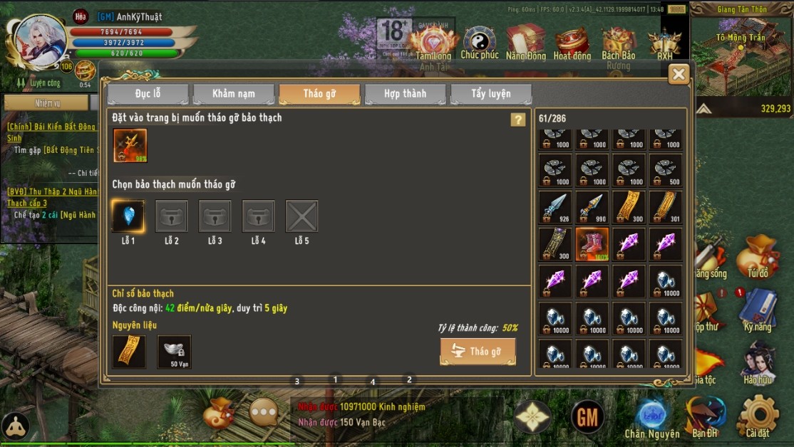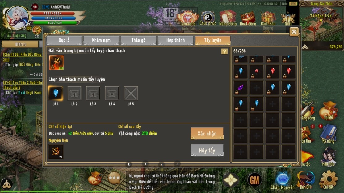 Mô tả: Người chơi sau khi khảm bảo thạch thành công, nếu không vừa ý với thuộc tính của bạo thạch vừa khảm có thể tiến hành tẩy luyện bảo thạch để thay đổi thuộc tính của Bảo Thạch đó.