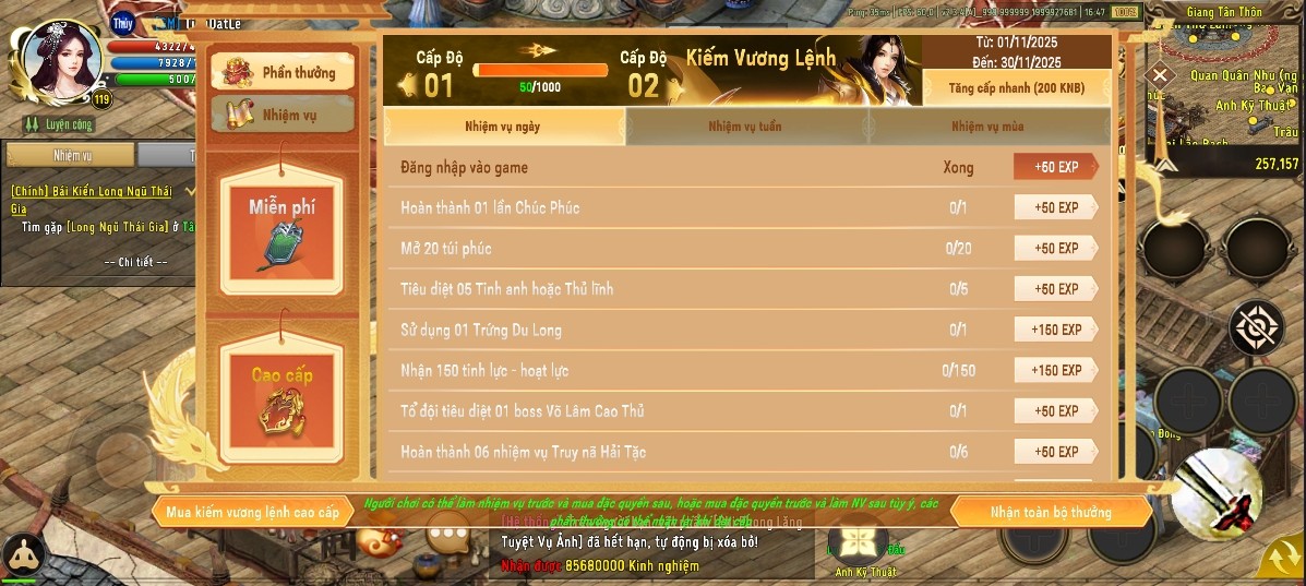 + Mở khóa 1 cấp của Kiếm Vương Lệnh