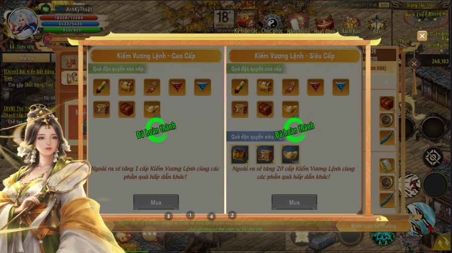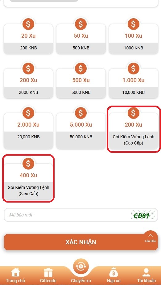 Bước 5: Chọn gói muốn mua (Kiếm vương lệnh Cao cấp hoặc Kiếm vương lệnh Siêu cấp)