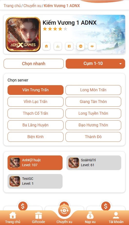 Bước 4: Chọn server và chọn nhân vật muốn mua