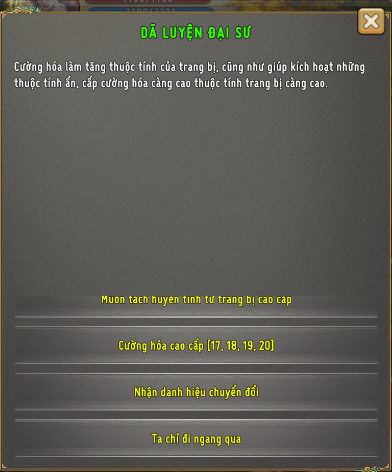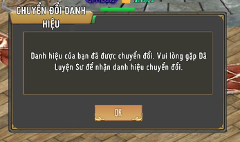 - Thao Tác cùng NPC Dã Luyện Đại Sư, lựa chọn "Nhận Danh Hiệu Chuyển Đổi"
